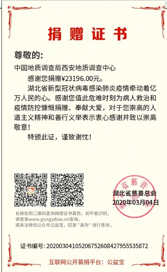 2020年2月29日至3月4日,自然资源部中国地质调查局西安地质调查中心组织中心党员干部职工开展自愿捐款支持防疫工作,倡议一经发出立即得到积极响应。短短五天时间,366名党员,捐款59622元,238名非党员,捐款23196元,共计604人,金额82818元。党员捐款按要求转至陕西科技工委党费户,非党员捐款转至湖北省慈善总会账户,目前均已到账并获得捐赠证书。大爱无疆,在举国上下团结一心、共同抗"疫"的战斗中,西安地调中心职工以此表达对战斗在疫情防控斗争第一线的医务人员、基层干部群众、公安民警和社区工作者的崇高敬意和鼎力支持。