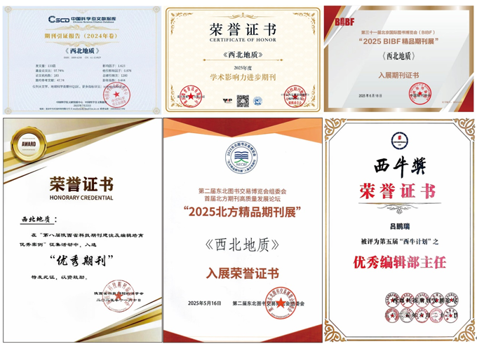 2025年度,《西北地质》CSCD影响因子为1.6226(地质学类期刊排名第13位,首次进入Q1分区),ScopusCiteScore值为2.2(增幅46.66%),中国科技核心影响因子为2.057(增幅53.62%),CNKI影响因子3.166(增幅35.47%),维普影响因子为2.632(增幅40.60%);荣获“第八届陕西省优秀科技期刊”“2025 BIBF精品期刊展入展期刊”“2025北方精品期刊展入展期刊”“期刊影响力进步期刊”等荣誉;编辑部吕鹏瑞荣获第五届西牛计划“优秀编辑部主任”称号。