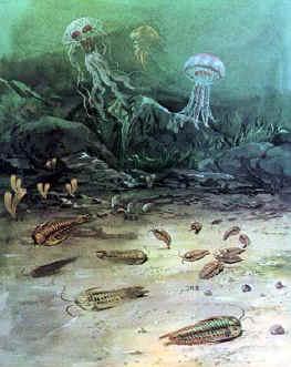 寒武纪:藻类、海绵、腕足动物、海林檎、三叶虫。