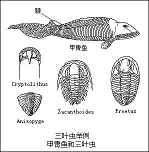 在早古生代海洋里生活着门类众多的生物。植物界以海藻为主。动物界出现了三叶虫和珊瑚、腕足类等。三叶虫是一种节肢动物,寒武纪是三叶虫的全盛时代。到奥陶纪时出现了软体动物门的头足纲,主要生物门类还有笔石、腕足类、三叶虫等。最值得注意的是在志留纪中期出现了脊椎动物——鱼类和最早的陆生植物。