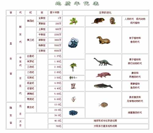 大家知道按地层的年龄将地球的年龄划分成一些单位,这样可以便于我们进行地球和生命演化的表述。人们习惯于以生物的情况来划分,这样就把整个46亿年划成两个大的单元:那些看不到或者很难见到生物的时代被称作隐生宙,而将可看到一定量生命以后的时代称作是显生宙。隐生宙的上限为地球的起源,其下限年代却不是一个绝对准确的数字,一般说来可推至6亿年前,也有推至5.7亿年前的。从6亿或5.7亿年以后到现在就被称作是显生宙。