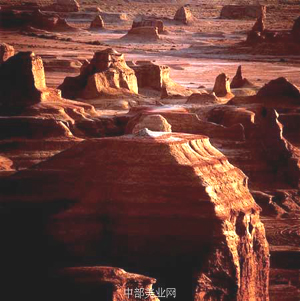 雅丹地形。河湖相土状堆积物地区发育的风蚀土墩和风蚀凹地相间的地貌形态。雅丹是中国维吾尔语,意为陡峭的土丘,因中国新疆孔雀河下游雅丹地区发育最为典型而命名。其发育过程是:挟沙气流磨蚀地面,地面出现风蚀沟槽。磨蚀作用进一步发展,沟槽扩展为风蚀洼地;洼地之间的地面相对高起,成为风蚀土墩。